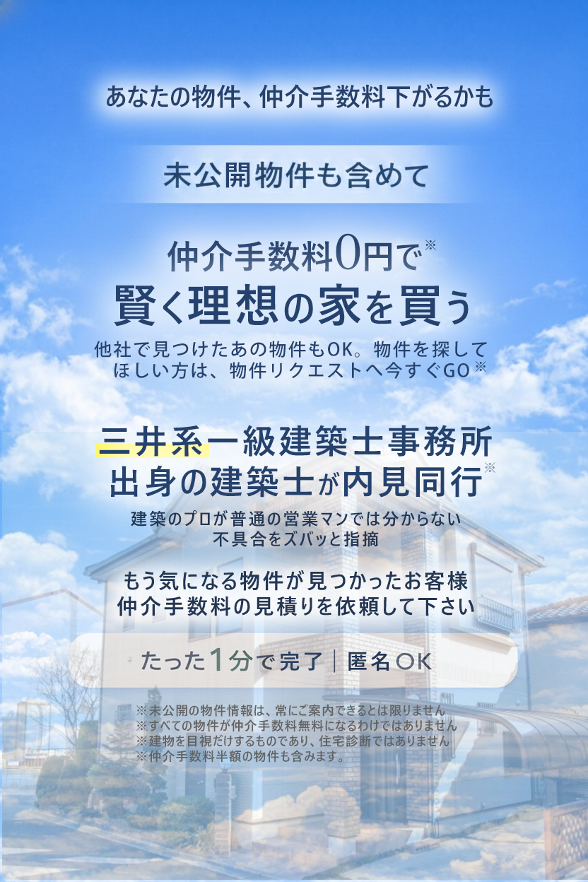 なお、仲介手数料が無料となる場合は、それ自体が大きな金額的メリットとなります。 まずは、交渉の余地があるかどうかを含めてご相談ください。